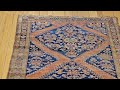This authentic late 19th century Persian Bidjar gallery rug, handwoven by Kurdish artisans in Northwest Persia. This antique Hashtrang (meaning “eight colors”) Bidjar features a striking geometric medallion design, with a series of interconnected medallions extending across the length of the rug. The medallions are set within a rich terracotta red field, creating a bold visual contrast against the abrash navy blue background. The natural abrash—subtle variations in tone from hand-dyed wool—adds depth, character, and unmistakable authenticity.