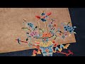 A truly stunning example of early 20th-century design, this vintage hand-knotted Chinese Art Deco Nichols rug is a rare gem from the 1900s. Set against an enchanting eggplant or pale mauve field, the rug features a graceful floral and landscape motif, with blooming trees, delicate flowers, and serene pagodas woven into a peaceful country scene. A rich dark blue border frames the composition, grounding the soft elegance of the central design.
