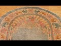 A truly rare and beautiful find, this oval-shaped Art Deco Chinese area rug from the early 1900s features a soft green background framed by a warm tan border, creating a graceful and unique silhouette rarely seen in traditional Chinese rug design.