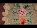 This charming early American hand-hooked rug was crafted in the early 1900s in the New England region of the United States. Featuring a classic floral design, the rug displays blossoms in brilliant vintage tones, radiating warmth, character, and nostalgic beauty.