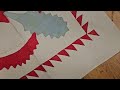 The composition features a refined floral appliqué pattern with four large-scale circular and leaf motifs rendered in soft pale blue and rich red tones, elegantly set against a luminous ivory ground. A finely executed sawtooth border frames the design, adding both visual structure and architectural balance to the overall composition. Each panel was individually hand-stitched, making this piece not only visually captivating, but also historically significant as a true labor of love.